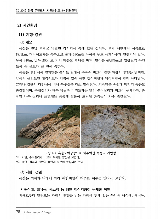2016 전국 무인도서 자연환경조사 영광권역 78 ? National Institute of Ecology 2 자연환경 1 지형?경관 ① 개요 목섬은 전남 영광군 낙월면 각이리에 속해 있는 섬이다. 영광 해안에서 서쪽으로 18.1km, 대각이도와는 북쪽으로 불과 140m를 사이에 두고 육계사주와 연결되어 있다. 동서 310m, 남북 300m로 거의 마름모 형태를 띠며, 면적은 48,496㎡로 영광권역 무인 도서 중 규모가 큰 편에 속한다. 이곳은 연안에서 멀지않은 송이도 일대에 속하여 비교적 강한 파랑의 영향을 받지만, 남쪽의 유인도인 대각이도와 인접해 있어 해안 침식지형과 퇴적지형이 함께 나타난다. 그러나 경관의 다양성에 비해 우수성은 다소 떨어진다. 기반암은 중생대 백악기 흑운모 화강암이며, 수평절리가 ...