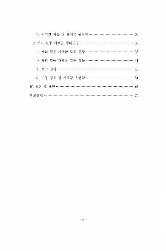v 라. 지역간 이동 및 개체군 유전학 ··················································· 30 2. 개리 월동 개체군 생태연구 ······························································· 33 가. 개리 월동 개체군 도래 현황 ······················································· 33 나. 개리 월동 개체군 일주 행동 ······················································· 41 다. 섭식 생태 ·········································································...