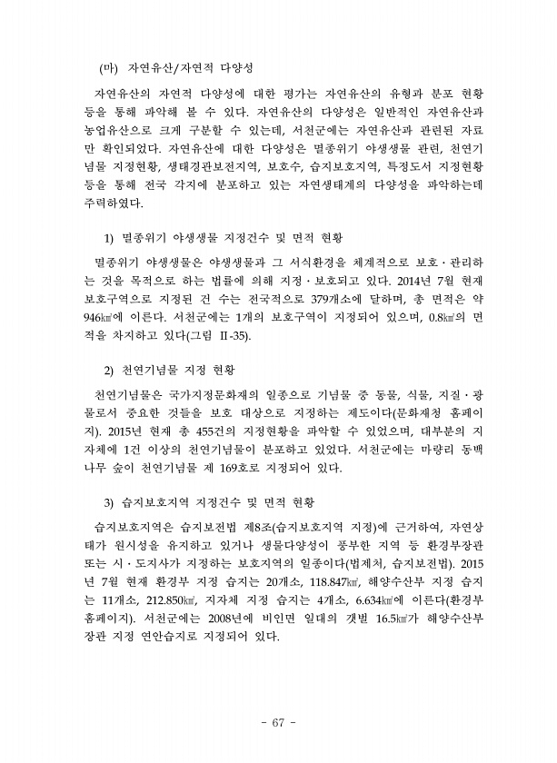 67 마 자연유산 자연적 다양성 자연유산의 자연적 다양성에 대한 평가는 자연유산의 유형과 분포 현황 등을 통해 파악해 볼 수 있다 자연유산의 다양성은 일반적인 자연유산과 농업유산으로 크게 구분할 수 있는데 서천군에는 자연유산과 관련된 자료 만 확인되었다 자연유산에 대한 다양성은 멸종위기 야생생물 관련 천연기 념물 지정현황 생태경관보전지역 보호수 습지보호지역 특정도서 지정현황 등을 통해 전국 각지에 분포하고 있는 자연생태계의 다양성을 파악하는데 주력하였다 멸종위기 야생생물 지정건수 및 면적 현황 멸종위기 야생생물은 야생생물과 그 서식환경을 체계적으로 보호 관리하 는 것을 목적으로 하는 법률에 의해 지정 보호되고 있다 년 월 현재 보호구역으로 지정된 건 수는 전국적으로 개소에 달하며 총 면적은 약 에 이른다 서...