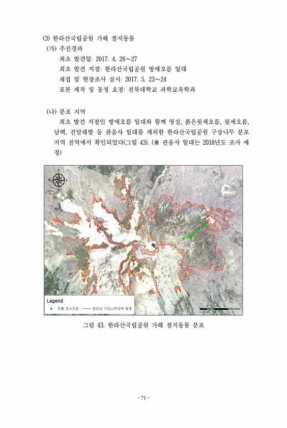 3 한라산국립공원 가해 절지동물 가 추진경과 최초 발견일2017. 4. 26∼27 최초 발견 지점한라산국립공원 방애오름 일대 채집 및 현장조사 실시2017. 5. 23∼24 표본 제작 및 동정 요청전북대학교 과학교육학과 나 분포 지역 최초 발견 지점인 방애오름 일대와 함께 영실, 붉은윗세오름, 윗세오름, 남벽, 진달래밭 등 관음사 일대를 제외한 한라산국립공원 구상나무 분포 지역 전역에서 확인되었다 그림 43 ※ 관음사 일대는 2018년도 조사 예 정 그림 43. 한라산국립공원 가해 절지동물 분포 71