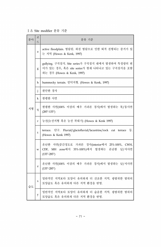71 분야 코 드 분류 기준 지형 a active floodplain. 범람원. 하천 범람으로 인한 퇴적 진행되는 증거가 있 는 지역 Howes & Kenk, 1997 g gullying. 구곡침식. Site series가 구곡침식 내에서 발생하여 특정량의 변 이가 있는 경우, 혹은 site series가 현재 나타나고 있는 구곡침식을 포함 하는 경우 Howes & Kenk, 1997 h hummocky terrain. 언덕지형. Howes & Kenk, 1997 j 완만한 경사 k 한랭한 사면 q 한랭한 사면 100% 이상의 매우 가파른 경사 에서 발생하는 북/동사면 285°-135° r 능선 능선지형 혹은 능선 꼭대기 Howes & Kenk 1997 t terrace. 단구. Fluvial/glaciof...