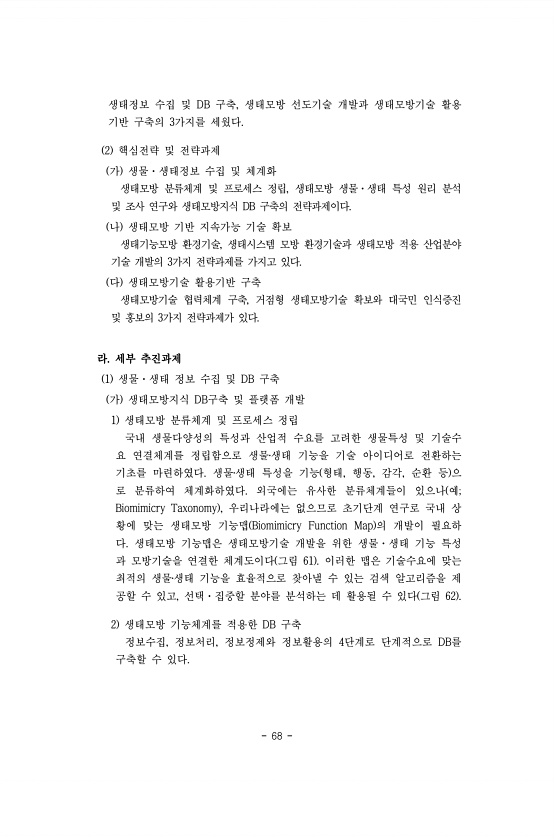 68 생태정보 수집 및 DB 구축, 생태모방 선도기술 개발과 생태모방기술 활용 기반 구축의 3가지를 세웠다. 2 핵심전략 및 전략과제 가 생물·생태정보 수집 및 체계화 생태모방 분류체계 및 프로세스 정립, 생태모방 생물·생태 특성 원리 분석 및 조사 연구와 생태모방지식 DB 구축의 전략과제이다. 나 생태모방 기반 지속가능 기술 확보 생태기능모방 환경기술, 생태시스템 모방 환경기술과 생태모방 적용 산업분야 기술 개발의 3가지 전략과제를 가지고 있다. 다 생태모방기술 활용기반 구축 생태모방기술 협력체계 구축, 거점형 생태모방기술 확보와 대국민 인식증진 및 홍보의 3가지 전략과제가 있다. 라. 세부 추진과제 1 생물·생태 정보 수집 및 DB 구축 가 생태모방지식 DB구축 및 플랫폼 개발 1 생태모방 분류체계 및 ...