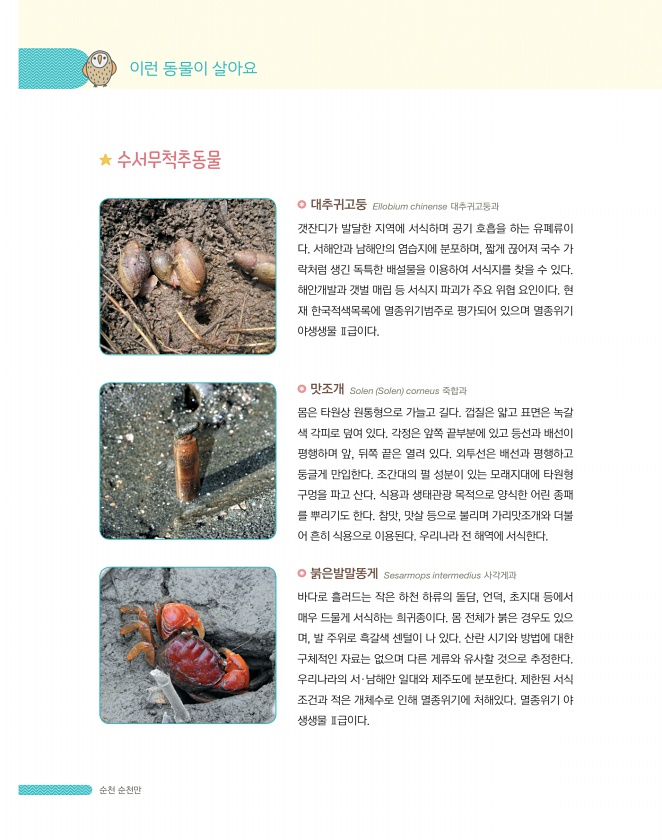 순천 순천만 수서무척추동물 대추귀고둥 Ellobium chinense 대추귀고둥과 갯잔디가 발달한 지역에 서식하며 공기 호흡을 하는 유폐류이 다. 서해안과 남해안의 염습지에 분포하며, 짧게 끊어져 국수 가 락처럼 생긴 독특한 배설물을 이용하여 서식지를 찾을 수 있다. 해안개발과 갯벌 매립 등 서식지 파괴가 주요 위협 요인이다. 현 재 한국적색목록에 멸종위기범주로 평가되어 있으며 멸종위기 야생생물Ⅱ급이다. 맛조개 Solen Solen corneus 죽합과 몸은 타원상 원통형으로 가늘고 길다. 껍질은 얇고 표면은 녹갈 색 각피로 덮여 있다. 각정은 앞쪽 끝부분에 있고 등선과 배선이 평행하며 앞, 뒤쪽 끝은 열려 있다. 외투선은 배선과 평행하고 둥글게 만입한다. 조간대의 펄 성분이 있는 모래지대에 타원형 구멍을 ...