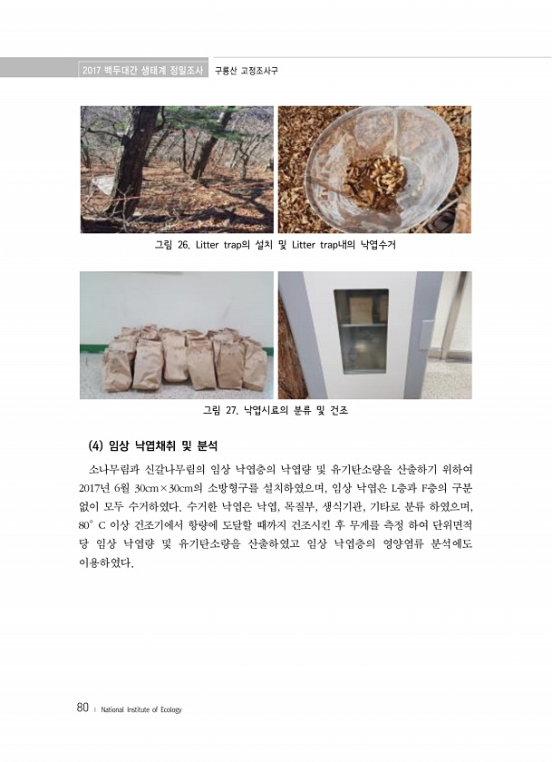 2017 백두대간 생태계 정밀조사 구룡산 고정조사구 80 ? National Institute of Ecology 그림 26. Litter trap의 설치 및 Litter trap내의 낙엽수거 그림 27. 낙엽시료의 분류 및 건조 4 임상 낙엽채취 및 분석 소나무림과 신갈나무림의 임상 낙엽층의 낙엽량 및 유기탄소량을 산출하기 위하여 2017년 6월 30cm×30cm의 소방형구를 설치하였으며, 임상 낙엽은 L층과 F층의 구분 없이 모두 수거하였다. 수거한 낙엽은 낙엽, 목질부, 생식기관, 기타로 분류 하였으며, 80°C 이상 건조기에서 항량에 도달할 때까지 건조시킨 후 무게를 측정 하여 단위면적 당 임상 낙엽량 및 유기탄소량을 산출하였고 임상 낙엽층의 영양염류 분석에도이용하였다.