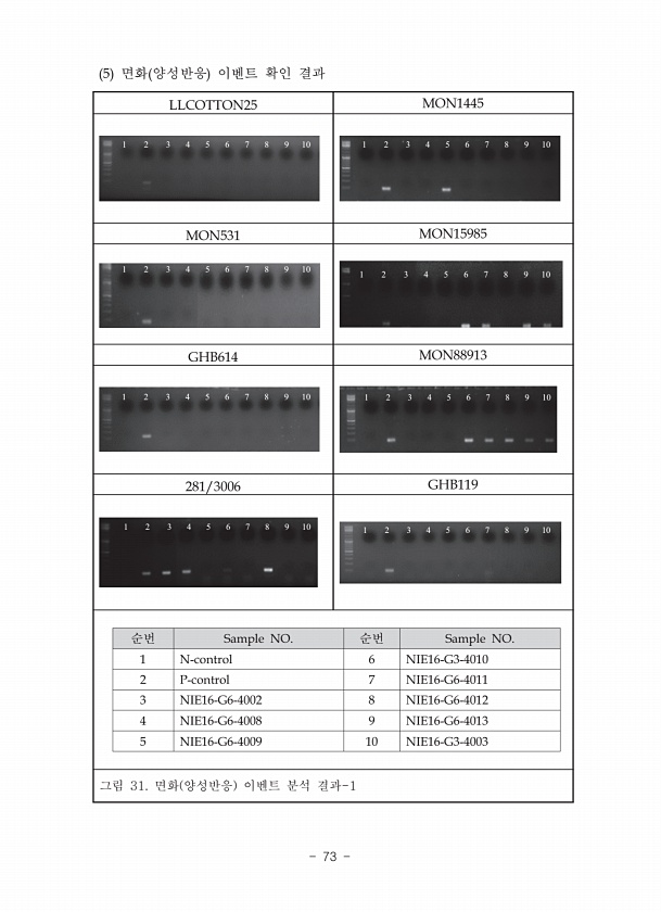 LLCOTTON25 MON1445 1 2 3 4 5 6 7 8 9 10 1 2 3 4 5 6 7 8 9 10 MON531 MON15985 1 2 3 4 5 6 7 8 9 10 1 2 3 4 5 6 7 8 9 10 GHB614 MON88913 1 2 3 4 5 6 7 8 9 10 1 2 3 4 5 6 7 8 9 10 281/3006 GHB119 1 2 3 4 5 6 7 8 9 10 1 2 3 4 5 6 7 8 9 10 순번 Sample NO. 순번 Sample NO. 1 N-control 6 NIE16-G3-4010 2 P-control 7 NIE16-G6-4011 3 NIE16-G6-4002 8 NIE16-G6-4012 4 NIE16-G6-4008 9 NIE16-G6-4013 5 NIE16-G6-4009 1...