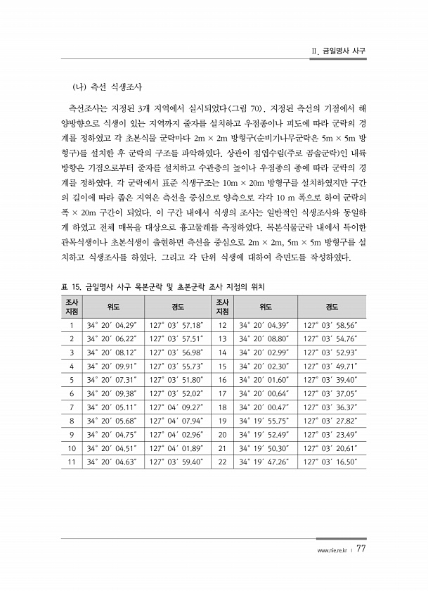 Ⅱ. 금일명사 사구 www.nie.re.kr ? 77 나 측선 식생조사 측선조사는 지정된 3개 지역에서 실시되었다 그림 70 지정된 측선의 기점에서 해 양방향으로 식생이 있는 지역까지 줄자를 설치하고 우점종이나 피도에 따라 군락의 경 계를 정하였고 각 초본식물 군락마다 2m × 2m 방형구 순비기나무군락은 5m × 5m 방 형구 를 설치한 후 군락의 구조를 파악하였다. 상관이 침엽수림 주로 곰솔군락 인 내륙 방향은 기점으로부터 줄자를 설치하고 수관층의 높이나 우점종의 종에 따라 군락의 경 계를 정하였다. 각 군락에서 표준 식생구조는 10m × 20m 방형구를 설치하였지만 구간 의 길이에 따라 좁은 지역은 측선을 중심으로 양측으로 각각 10 m 폭으로 하여 군락의 폭 × 20m 구간이 되었다. 이 구간 내에서...