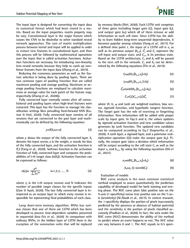 Habitat Potential Mapping of Roe Deer https//doi.org/10.22920/PNIE.2021.2.1.1 7 The input layer is designed for converting the input data to numerical format which had been stored in a matrix. Based on the input properties, matrix property may be vary. Convolutional layer is the major feature which causes the CNN to be dissimilar to other standard neural network approaches. The sum of matrix multi...