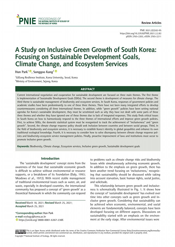 Received March 18, 2021; Revised March 25, 2021; Accepted March 25, 2021 *Corresponding authorHun Park e-mail ecology@korea.ac.kr https//orcid.org/ 0000-0001-6367-238X Hun Park1 , Sunggoo Kang2 Review Articles A Study on Inclusive Green Growth of South KoreaFocusing on Sustainable Development Goals, Climate Change, and Ecosystem Services ABSTRACT Introduction Current international negotiation and ...