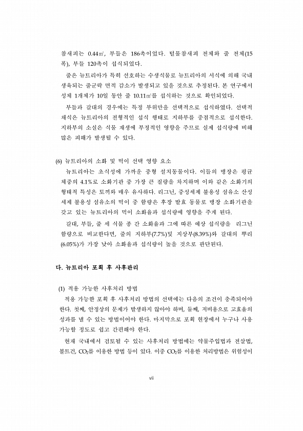vii 참새피는 0.44㎡, 부들은 186촉이었다. 털물참새피 전체와 줄 전체 15 폭 , 부들 120촉이 섭식되었다. 줄은 뉴트리아가 특히 선호하는 수생식물로 뉴트리아의 서식에 의해 국내 생육되는 줄군락 면적 감소가 발생되고 있을 것으로 추정된다. 본 연구에서 성체 1개체가 10일 동안 줄 10.11㎡를 섭식하는 것으로 확인되었다. 부들과 갈대의 경우에는 특정 부위만을 선택적으로 섭식하였다. 선택적 채식은 뉴트리아의 전형적인 섭식 행태로 지하부를 중점적으로 섭식한다. 지하부의 소실은 식물 재생에 부정적인 영향을 주므로 실제 섭식량에 비해 많은 피해가 발생될 수 있다. 6 뉴트리아의 소화 및 먹이 선택 영향 요소 뉴트리아는 초식성에 가까운 중형 설치동물이다. 이들의 맹장은 평균 체중의 4.1%로 소화기관 중...