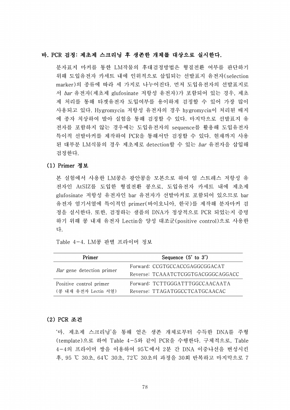 78 바. PCR 검정제초제 스크리닝 후 생존한 개체를 대상으로 실시한다. 분자표지 마커를 통한 LM작물의 후대검정방법은 형질전환 여부를 판단하기 위해 도입유전자 카세트 내에 인위적으로 삽입되는 선발표지 유전자 selection marker 의 종류에 따라 세 가지로 나누어진다. 먼저 도입유전자의 선발표지로 서 bar 유전자 제초제 glufosinate 저항성 유전자 가 포함되어 있는 경우, 제초 제 처리를 통해 타겟유전자 도입여부를 용이하게 검정할 수 있어 가장 많이 사용되고 있다. Hygromycin 저항성 유전자의 경우 hygromycin이 처리된 배지 에 종자 치상하여 발아 실험을 통해 검정할 수 있다. 마지막으로 선발표지 유 전자를 포함하지 않는 경우에는 도입유전자의 sequence를 활용해 도입유...