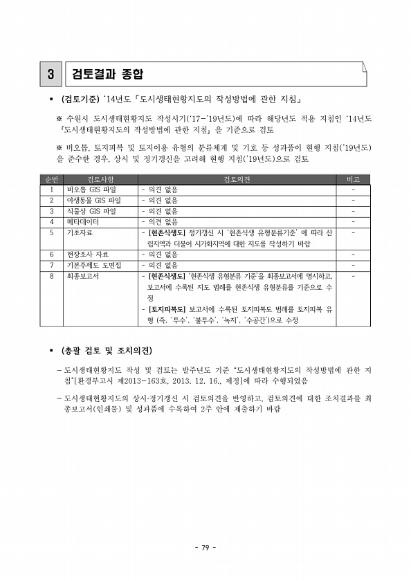 43 식물 88종 개가시나무 Ⅱ급 개병풍 Ⅱ급 갯봄맞이꽃 Ⅱ급 생물정보 바로가기 생물정보 바로가기 생물정보 바로가기 부 록5 ‘17-’19년도 에 따라 해당년도 적용 지침인 ‘14년도 「도시생태현황지도의 작성방법에 관한 지침」을 기준으로 검토 ※ 비오톱, 토지피복 및 토지이용 유형의 분류체계 및 기호 등 성과품이 현행 지침 ’19년도 을 준수한 경우, 상시 및 정기갱신을 고려해 현행 지침 ’19년도 으로 검토 순번 검토사항 검토의견 비고 1 비오톱 GIS 파일 의견 없음 2 야생동물 GIS 파일 의견 없음 3 식물상 GIS 파일 의견 없음 4 메타데이터 의견 없음 5 기초자료 [현존식생도] 정기갱신 시 ‘현존식생 유형분류기준’ 에 따라 산 림지역과 더불어 시가화지역에 대한 지도를 작성하기 바람 6 현장조사 ...