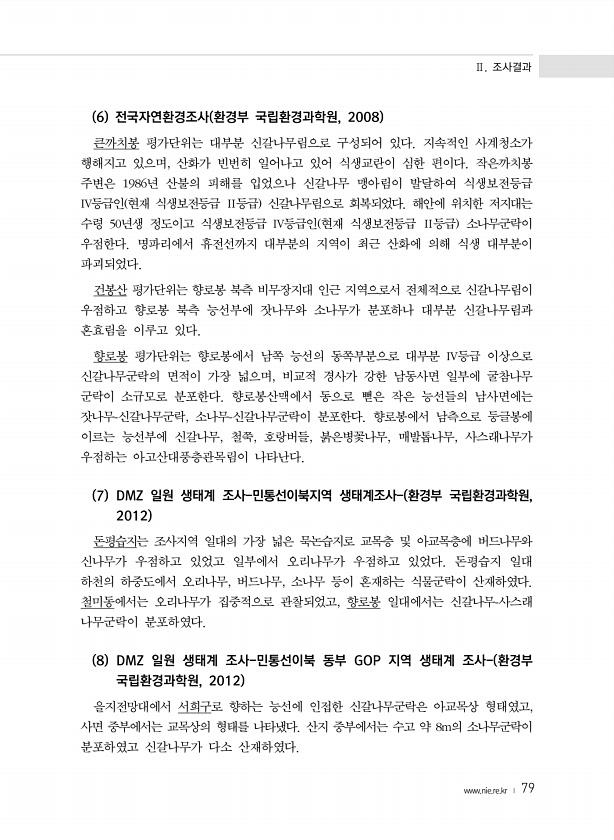 Ⅱ. 조사결과 www.nie.re.kr ? 79 6 전국자연환경조사 환경부 국립환경과학원, 2008 큰까치봉 평가단위는 대부분 신갈나무림으로 구성되어 있다. 지속적인 사계청소가 행해지고 있으며, 산화가 빈번히 일어나고 있어 식생교란이 심한 편이다. 작은까치봉 주변은 1986년 산불의 피해를 입었으나 신갈나무 맹아림이 발달하여 식생보전등급 Ⅳ등급인 현재 식생보전등급 Ⅱ등급 신갈나무림으로 회복되었다. 해안에 위치한 저지대는 수령 50년생 정도이고 식생보전등급 Ⅳ등급인 현재 식생보전등급 Ⅱ등급 소나무군락이 우점한다. 명파리에서 휴전선까지 대부분의 지역이 최근 산화에 의해 식생 대부분이 파괴되었다. 건봉산 평가단위는 향로봉 북측 비무장지대 인근 지역으로서 전체적으로 신갈나무림이 우점하고 향로봉 북측 능선부에 잣나무...