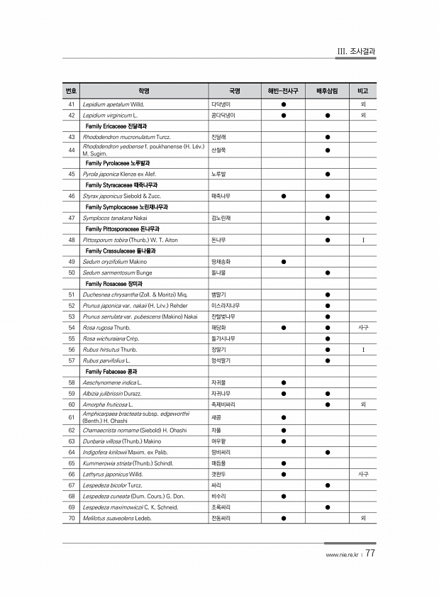 III. 조사결과 www.nie.re.kr ? 77 번호 학명 국명 해빈-전사구 배후삼림 비고 41 Lepidium apetalum Willd. 다닥냉이 ● 외 42 Lepidium virginicum L. 콩다닥냉이 ● ● 외 Family Ericaceae 진달래과 43 Rhododendron mucronulatum Turcz. 진달래 ● 44 Rhododendron yedoense f. poukhanense H. Le?v. M. Sugim. 산철쭉 ● Family Pyrolaceae 노루발과 45 Pyrola japonica Klenze ex Alef. 노루발 ● Family Styracaceae 때죽나무과 46 Styrax japonicus Siebold & Zucc. 때죽나무 ● ● Family Sy...