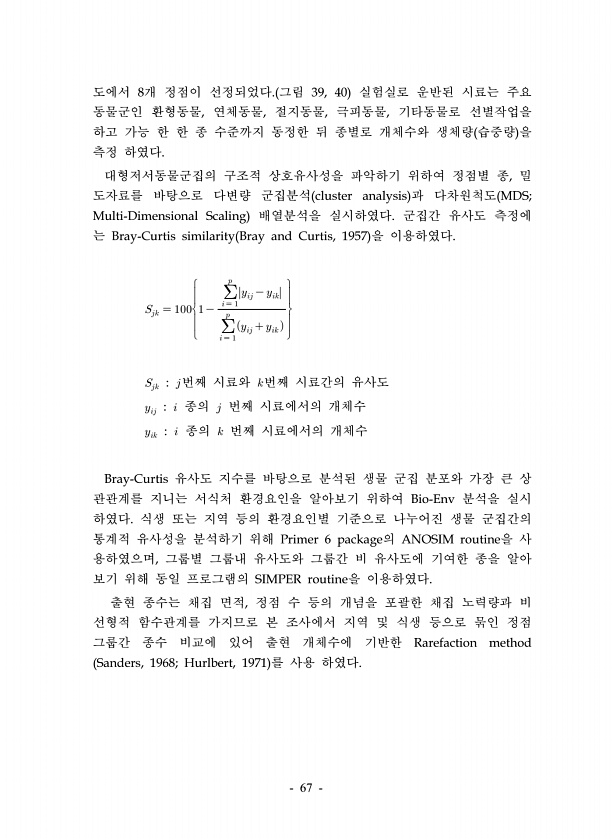 67 도에서 8개 정점이 선정되었다. 그림 39, 40 실험실로 운반된 시료는 주요 동물군인 환형동물, 연체동물, 절지동물, 극피동물, 기타동물로 선별작업을 하고 가능 한 한 종 수준까지 동정한 뒤 종별로 개체수와 생체량 습중량 을 측정 하였다. 대형저서동물군집의 구조적 상호유사성을 파악하기 위하여 정점별 종, 밀 도자료를 바탕으로 다변량 군집분석 cluster analysis 과 다차원척도 MDS; Multi-Dimensional Scaling 배열분석을 실시하였다. 군집간 유사도 측정에 는 Bray-Curtis similarity Bray and Curtis, 1957 을 이용하였다. ?? ?? ??? ??? ?? ??? ??? ?...
