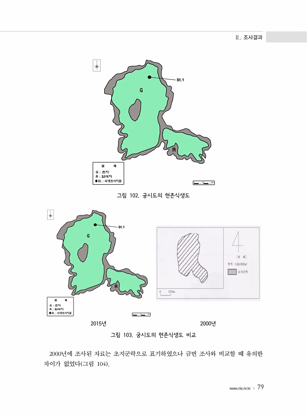 Ⅱ. 조사결과 www.nie.re.kr ? 79 그림 102. 궁시도의 현존식생도 2015년 2000년 그림 103. 궁시도의 현존식생도 비교 2000년에 조사된 자료는 초지군락으로 표기하였으나 금번 조사와 비교할 때 유의한 차이가 없었다 그림 104