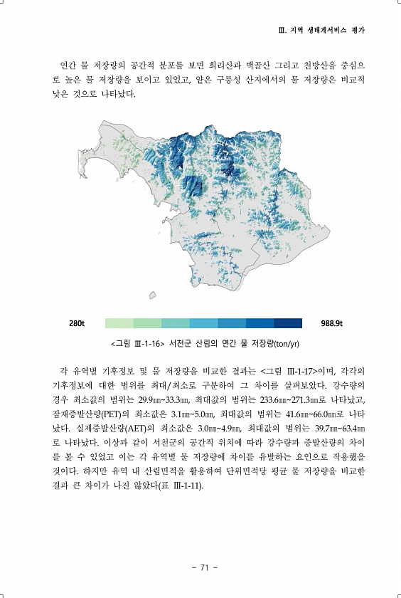 Ⅲ. 지역 생태계서비스 평가 71 연간 물 저장량의 공간적 분포를 보면 희리산과 백골산 그리고 천방산을 중심으 로 높은 물 저장량을 보이고 있었고, 얕은 구릉성 산지에서의 물 저장량은 비교적 낮은 것으로 나타났다. 280t 988.9t 그림 Ⅲ-1-16 서천군 산림의 연간 물 저장량 ton/yr 각 유역별 기후정보 및 물 저장량을 비교한 결과는 그림 Ⅲ-1-17 이며, 각각의 기후정보에 대한 범위를 최대/최소로 구분하여 그 차이를 살펴보았다. 강수량의 경우 최소값의 범위는 29.9㎜33.3㎜, 최대값의 범위는 233.6㎜271.3㎜로 나타났고, 잠재증발산량 PET 의 최소값은 3.1㎜5.0㎜, 최대값의 범위는 41.6㎜66.0㎜로 나타 났다. 실제증발산량 AET 의 최소값은 3.0㎜4.9㎜, 최대값의 범위는...