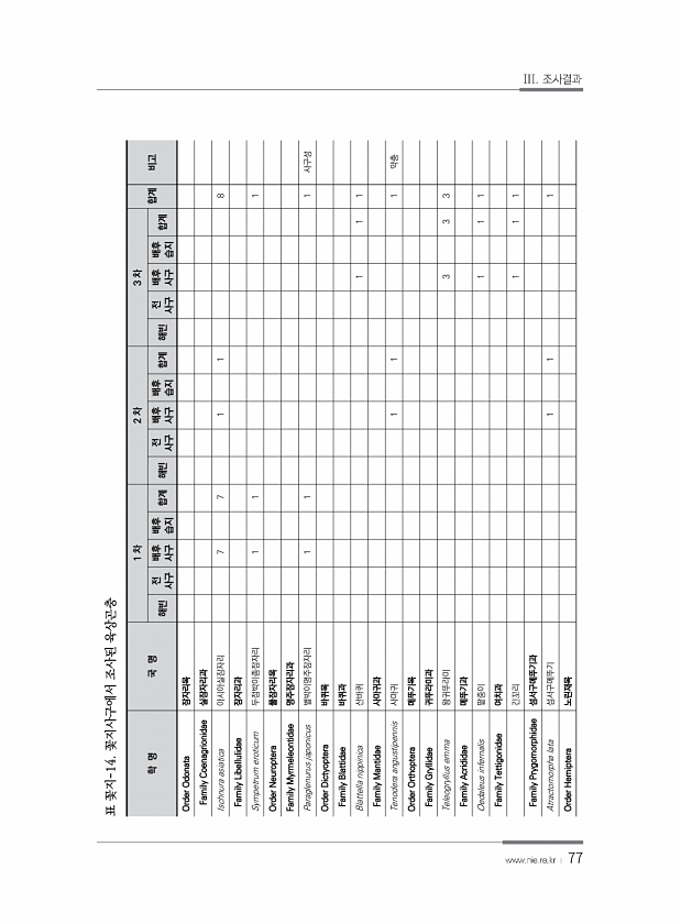77 학 명 국 명 1 차 2 차 3 차 합계 비고 해빈 전 사구 배후 사구 배후 습지 합계 해빈 사구 전 배후 사구 배후 습지 합계 해빈 사구 전 배후 사구 배후 습지 합계 Order Odonata 잠자리목 Family Coenagrionidae 실잠자리과 Ischnura asiatica 아시아실잠자리 7 7 1 1 8 Family Libellulidae 잠자리과 Sympetrum eroticum 두점박이좀잠자리 1 1 1 Order Neuroptera 풀잠자리목 Family Myrmeleontidae 명주잠자리과 Paraglenurus japonicus 별박이명주잠자리 1 1 1 사구성 Order Dictyoptera 바퀴목 Family Blattidae 바퀴과 Blattella nippinica 산바퀴...