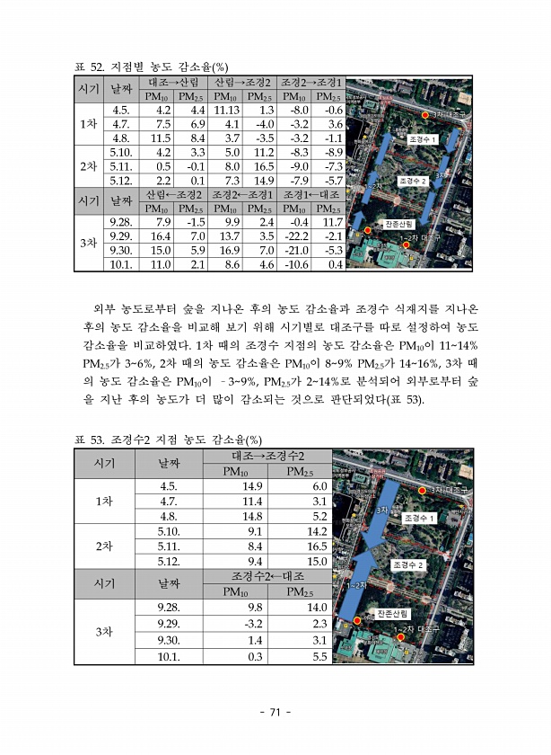 71 시기 날짜 대조→산림 산림→조경2 조경2→조경1 PM10 PM2.5 PM10 PM2.5 PM10 PM2.5 1차 4.5. 4.2 4.4 11.13 1.3 -8.0 -0.6 4.7. 7.5 6.9 4.1 -4.0 -3.2 3.6 4.8. 11.5 8.4 3.7 -3.5 -3.2 -1.1 2차 5.10. 4.2 3.3 5.0 11.2 -8.3 -8.9 5.11. 0.5 -0.1 8.0 16.5 -9.0 -7.3 5.12. 2.2 0.1 7.3 14.9 -7.9 -5.7 시기 날짜 산림←조경2 조경2←조경1 조경1←대조 PM10 PM2.5 PM10 PM2.5 PM10 PM2.5 3차 9.28. 7.9 -1.5 9.9 2.4 -0.4 11.7 9.29. 16.4 7.0 13.7 3.5 -22.2 -2.1 9....