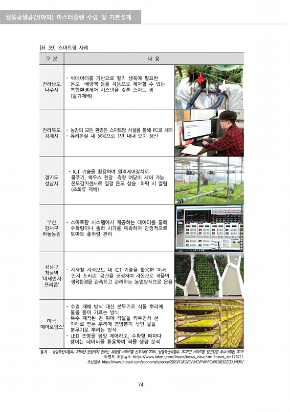 생물공생공간 야외 마스터플랜 수립 및 기본설계 74 구 분 내 용 전라남도 나주시 빅데이터를 기반으로 딸기 생육에 필요한 온도ㆍ배양액 등을 자동으로 제어할 수 있는 복합환경제어 시스템을 갖춘 스마트 팜 딸기재배 전라북도 김제시 농장의 모든 환경은 스마트팜 시설을 통해 PC로 제어 유리온실 내 생육으로 1년 내내 오이 생산 경기도 성남시 ICT 기술을 활용하여 원격제어장치로 물주기, 하우스 천장ㆍ측창 여닫이 제어 가능 온도감지센서로 일정 온도 상승ㆍ하락 시 알림 초화류 재배 부산 강서구 하늘농원 스마트팜 시스템에서 제공하는 데이터를 통해 수확량이나 출하 시기를 예측하여 안정적으로 토마토 출하량 관리 강남구 청담역 ‘미세먼지 프리존’ 지하철 지하보도 내 ICT 기술을 활용한 ‘미세 먼지 프리존’ 공간을 조성하여...