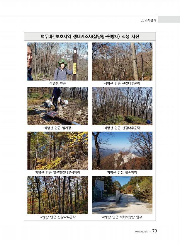 Ⅱ. 조사결과 www.nie.re.kr ? 79 백두대간보호지역 생태계조사 삽당령원방재 식생 사진 석병산 인근 석병산 인근 신갈나무군락 석병산 인근 헬기장 석병산 인근 신갈나무군락 자병산 인근 일본잎갈나무식재림 자병산 정상 훼손지역 자병산 인근 신갈나무군락 자병산 인근 석회석광산입구