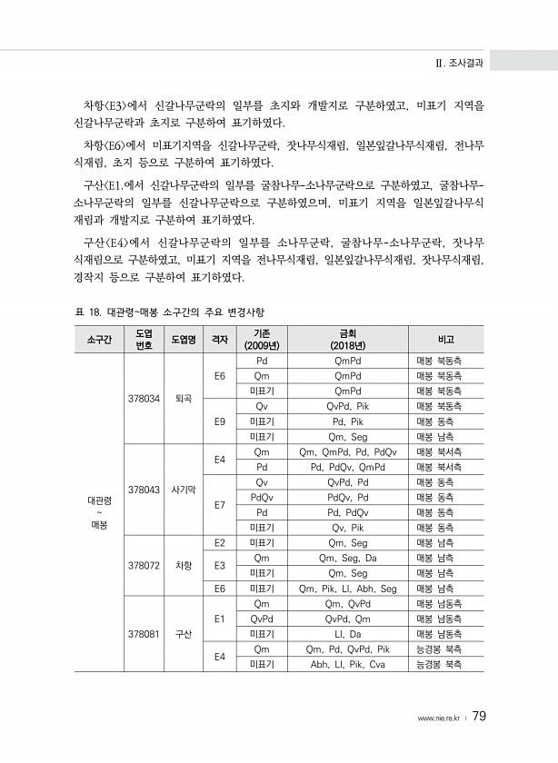 Ⅱ. 조사결과 www.nie.re.kr ? 79 차항 E3 에서 신갈나무군락의 일부를 초지와 개발지로 구분하였고, 미표기 지역을 신갈나무군락과 초지로 구분하여 표기하였다. 차항 E6 에서 미표기지역을 신갈나무군락, 잣나무식재림, 일본잎갈나무식재림, 전나무 식재림, 초지 등으로 구분하여 표기하였다. 구산 E1.에서 신갈나무군락의 일부를 굴참나무-소나무군락으로 구분하였고, 굴참나무- 소나무군락의 일부를 신갈나무군락으로 구분하였으며, 미표기 지역을 일본잎갈나무식 재림과 개발지로 구분하여 표기하였다. 구산 E4 에서 신갈나무군락의 일부를 소나무군락, 굴참나무-소나무군락, 잣나무 식재림으로 구분하였고, 미표기 지역을 전나무식재림, 일본잎갈나무식재림, 잣나무식재림, 경작지 등으로 구분하여 표기하였다. 소구간 도엽 번호...