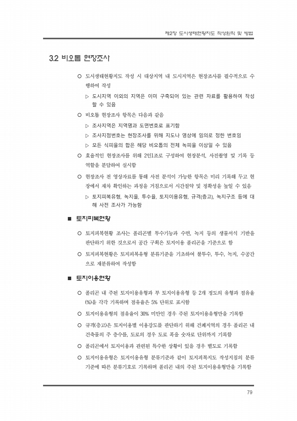 제2장 도시생태현황지도 작성원칙 및 방법 79 3.2 비오톱 현장조사 ¡ 도시생태현황지도 작성 시 대상지역 내 도시지역은 현장조사를 필수적으로 수 행하여 작성 ▷ 도시지역 이외의 지역은 이미 구축되어 있는 관련 자료를 활용하여 작성 할 수 있음 ¡ 비오톱 현장조사 항목은 다음과 같음 ▷ 조사지역은 지역명과 도면번호로 표기함 ▷ 조사지점번호는 현장조사를 위해 지도나 영상에 임의로 정한 번호임 ▷ 모든 식피율의 합은 해당 비오톱의 전체 녹피율 이상일 수 있음 ¡ 효율적인 현장조사를 위해 2인1조로 구성하여 현장분석, 사진촬영 및 기록 등 역할을 분담하여 실시함 ¡ 현장조사 전 영상자료를 통해 사전 분석이 가능한 항목은 미리 기록해 두고 현 장에서 재차 확인하는 과정을 거침으로서 시간절약 및 정확성을 높일 수 있...