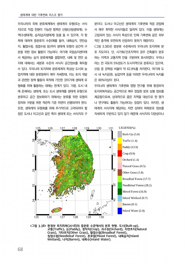 생태계에 대한 기후변화 리스크 평가 68 우리나라의 피복 분류체계에서 생태계의 유형 또는 서식 지 으로 직접 전환이 가능한 항목은 산림 산림생태계 , 수 역 수생태계 , 습지 습지생태계 등을 들 수 있으며, 각 항 목에 대하여 중분류의 수준 예를 들어, 내륙습지, 연안습 지, 활엽수림, 침엽수림 등 까지 생태계 유형의 공간적 구 분을 위한 정보 활용이 가능하다. 여기에 국립습지센터에 서 제공하는 습지 분류체계를 결합하면, 내륙 및 연안 습 지에 대해서는 세분류 수준의 서식지 공간정보를 획득할 수 있다. 우리나라 토지피복 분류체계의 특성상 도시와 농 업지역에 대한 분류항목이 매우 자세한데, 이는 토지 개발 과 관련한 정책 활용의 목적에 기인한 것이기에 생태계 유 형화를 위해 활용하는 데에는 한계가 있다. 가령...
