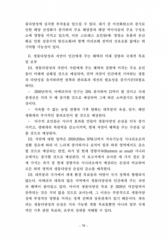 물다양성에 심각한 부작용을 일으킬 수 있다. 대기 중 이산화탄소의 증가로 인한 해양 산성화가 증가하여 주요 해양종과 해양 먹이사슬의 주요 구성요 소에 영향을 미치고 있으며, 다른 스트레스 요인들 예영양소 유출과 온난 화로 인한 상층수의 탈산소화 과 함께 카리브해 전역의 산호초를 없애는 데 기여할 가능성이 있다. D. 생물다양성과 자연이 인간에게 주는 혜택의 미래 경향과 국제적 목표 및 포부 D1. 생물다양성과 자연이 사람에게 주는 혜택의 경향에 미치는 주요 요인 들이 미래에 심해질 것으로 예상되며, 만약 자연이 인간에게 기여하는 생물 의 다양성을 유지하려면 정책과 관리효과 개선의 필요성을 증가시킨다 필요 하다 2050년까지, 아메리카의 인구는 20% 증가하여 12억이 될 것이고 국내 총생산은 거의 두 배 증...