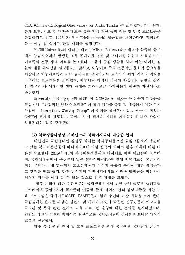 79 COAT Climate-Ecological Observatory for Arctic Tundra 를 소개했다. 연구 설계, 통계 모델, 정보 및 간행물 배포를 통한 지식 개선 등의 적응 및 반복 프로토콜을 통합한다고 밝힘. COAT가 먹이그물 food-web 접근법을 채택한다고 지적하며 북극 여우 및 설치류 관찰 사례를 설명했다. McGill University의 앨리슨 패터슨 Allison Patterson 는 캐내다 북극해 동부 에서 참솜깃오리에 발생한 조류 콜레라를 검출 및 모니터링 하는데 사용된 이누 이트족의 전통 생태 지식을 논의했다. 조류가 군집 생활을 하며 이는 이러한 질 환에 대한 취약성을 설명한다고 밝히고, 이누이트 족의 전통적인 문화적 중요성을 회상하고 이누이트족이 조류 콜레라를 감시...