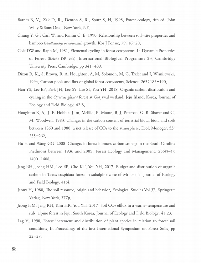 88 Barnes B. V., Zak D. R., Denton S. R., Spurr S. H. 1998. Forest ecology. 4th ed. John Wiliy & Sons Onc., New York, NY. Chung Y. G., Carl W. and Ramm C. E. 1990. Relationship between soil-site properties and bamboo Phullostachys bambusoides growth. Kor J For oc. 7916-20. Cole DW and Rapp M. 1981. Elemental cycling in forest ecosystems. In Dynamic Properties of Forest Reiche DE, eds International...
