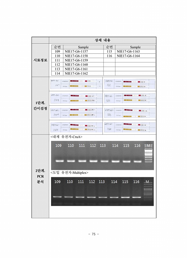 75 상세 내용 시료정보 순번 Sample 순번 Sample 109 NIE17-G6-1157 115 NIE17-G6-1163 110 NIE17-G6-1158 116 NIE17-G6-1164 111 NIE17-G6-1159 112 NIE17-G6-1160 113 NIE17-G6-1161 114 NIE17-G6-1162 1단계. 간이검정 2단계. PCR 분석 내재 유전자-CruA 도입 유전자-Multiplex