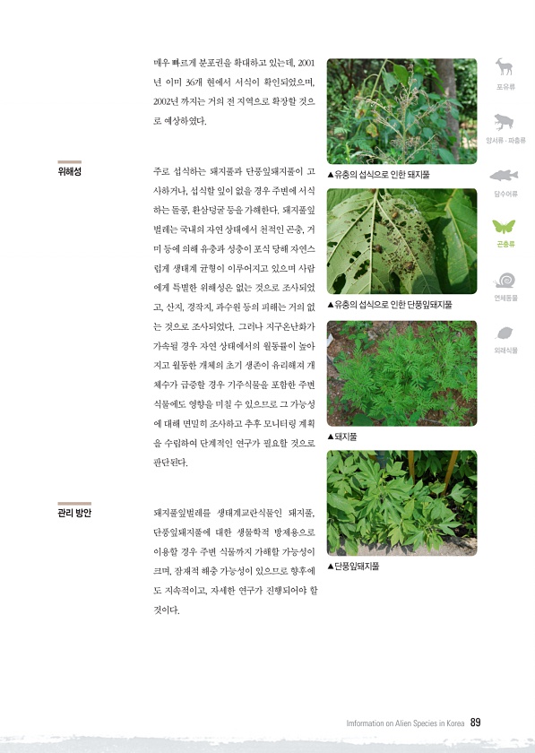 포유류 양서류 · 파충류 담수어류 곤충류 연체동물 외래식물 Imformation on Alien Species in Korea 89 매우 빠르게 분포권을 확대하고 있는데, 2001 년 이미 36개 현에서 서식이 확인되었으며, 2002년 까지는 거의 전 지역으로 확장할 것으 로 예상하였다. 위해성 주로 섭식하는 돼지풀과 단풍잎돼지풀이 고 사하거나, 섭식할 잎이 없을 경우 주변에 서식 하는 돌콩, 환삼덩굴 등을 가해한다. 돼지풀잎 벌레는 국내의 자연 상태에서 천적인 곤충, 거 미 등에 의해 유충과 성충이 포식 당해 자연스 럽게 생태계 균형이 이루어지고 있으며 사람 에게 특별한 위해성은 없는 것으로 조사되었 고, 산지, 경작지, 과수원 등의 피해는 거의 없 는 것으로 조사되었다. 그러나 지구온난화가 가속될 경우 ...