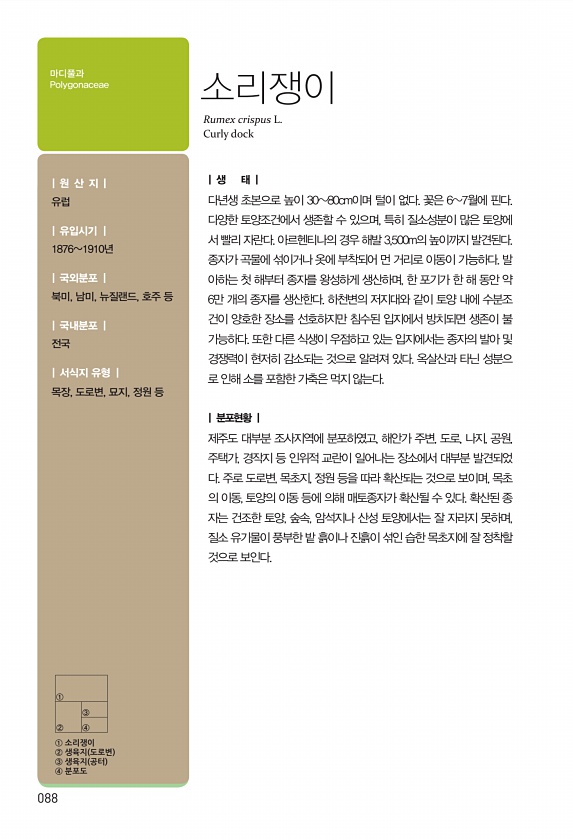 088 ① ② ③ ④ ① 소리쟁이 ② 생육지 도로변 ③ 생육지 공터 ④ 분포도 | 생 태 | 다년생 초본으로 높이 3080cm이며 털이 없다. 꽃은 67월에 핀다. 다양한 토양조건에서 생존할 수 있으며, 특히 질소성분이 많은 토양에 서 빨리 자란다. 아르헨티나의 경우 해발 3,500m의 높이까지 발견된다. 종자가 곡물에 섞이거나 옷에 부착되어 먼 거리로 이동이 가능하다. 발 아하는 첫 해부터 종자를 왕성하게 생산하며, 한 포기가 한 해 동안 약 6만 개의 종자를 생산한다. 하천변의 저지대와 같이 토양 내에 수분조 건이 양호한 장소를 선호하지만 침수된 입지에서 방치되면 생존이 불 가능하다. 또한 다른 식생이 우점하고 있는 입지에서는 종자의 발아 및 경쟁력이 현저히 감소되는 것으로 알려져 있다. 옥살산과 타닌 ...