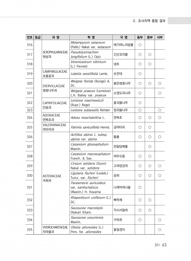 Ⅱ. 조사지역 종합 결과 63 번호 등급 과 명 학 명 국 명 동부 중부 서부 316 SCROPHULARIACEAE 현삼과 Melampyrum setaceum Palib. Nakai var. setaceum 애기며느리밥풀 ○ 317 Pseudolysimachion longifolium L. Opiz 긴산꼬리풀 ○ ○ 318 Veronicastrum sibiricum L. Pennell 냉초 ○ ○ 319 CAMPANULACEAE 초롱꽃과 Lobelia sessilifolia Lamb. 숫잔대 ○ 320 DIERVILLACEAE 병꽃나무과 Weigela florida Bunge A. DC. 붉은병꽃나무 ○ ○ ○ 321 Weigela praecox Lemoine L.H. Bailey var. praeco...