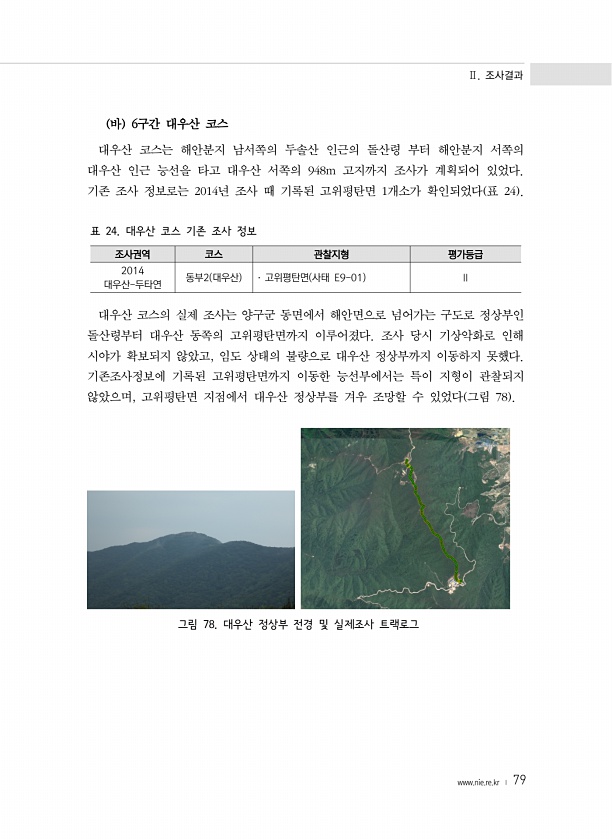 Ⅱ. 조사결과 www.nie.re.kr ? 79 바 6구간 대우산 코스 대우산 코스는 해안분지 남서쪽의 두솔산 인근의 돌산령 부터 해안분지 서쪽의 대우산 인근 능선을 타고 대우산 서쪽의 948m 고지까지 조사가 계획되어 있었다. 기존 조사 정보로는 2014년 조사 때 기록된 고위평탄면 1개소가 확인되었다 표 24 조사권역 코스 관찰지형 평가등급 2014 대우산-두타연 동부2 대우산 ? 고위평탄면 사태 E9-01 Ⅱ 표 24. 대우산 코스 기존 조사 정보 대우산 코스의 실제 조사는 양구군 동면에서 해안면으로 넘어가는 구도로 정상부인 돌산령부터 대우산 동쪽의 고위평탄면까지 이루어졌다. 조사 당시 기상악화로 인해 시야가 확보되지 않았고, 임도 상태의 불량으로 대우산 정상부까지 이동하지 못했다. 기존조사정보에 기록...
