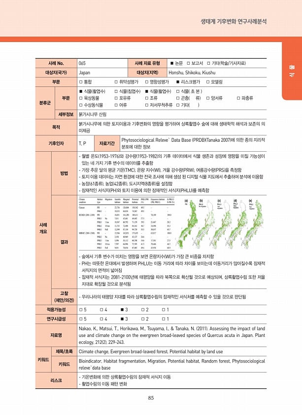 85 생태계 기후변화 연구사례분석 식 물 사례 No. 065 사례 자료 유형 ■ 논문 □ 보고서 □ 기타 학술/기사자료 대상지 국가 Japan 대상지 지역 Honshu, Shikoku, Kiushu 부문 □ 통합 □ 취약성평가 □ 영향성평가 ■ 리스크평가 □ 모델링 분류군 부문 ■ 식물 활엽수 □ 식물 침엽수 ■ 식물 활엽수 □ 식물 초 본 □ 육상동물 □ 포유류 □ 조류 □ 곤충 류 □ 양서류 □ 파충류 □ 수상동식물 □ 어류 □ 저서무척추류 □ 기타 세부정보 붉가시나무 산림 목적 붉가시나무에 의한 토지이용과 기후변화의 영향을 평가하여 상록활엽수 숲에 대해 생태학적 해석과 보존의 의 미제공 기후인자 T, P 자료기간 Phytosociological Releve` Data Base PRDB Tanaka 20...