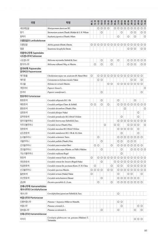 85 새모래덩굴 Menispermum dauricum DC. ○ ○ ○ ○ ○ ○ ○ ○ ○ ○ ○ ○ ○ ○ 방기 Sinomenium acutum Thunb. Rehder & E. H. Wilson ○ ○ ○ ○ ○ ○ 함박이 Stephania japonica Thunb. Miers ○ ○ ○ ○ 으름덩굴과 Lardizabalaceae 으름덩굴 Akebia quinata Houtt. Decne. ○ ○ ○ ○ ○ ○ ○ ○ ○ ○ ○ ○ ○ ○ ○ ○ ○ 멀꿀 Stauntonia hexaphylla Decne. ○ ○ ○ ○ ○ 무환자나무목 Sapindales 나도밤나무과 Sabiaceae 나도밤나무 Meliosma myriantha Siebold & Zucc. ○ ○ ○ ○ ○ ○ ○ ○ ○ 합다리나무 ...