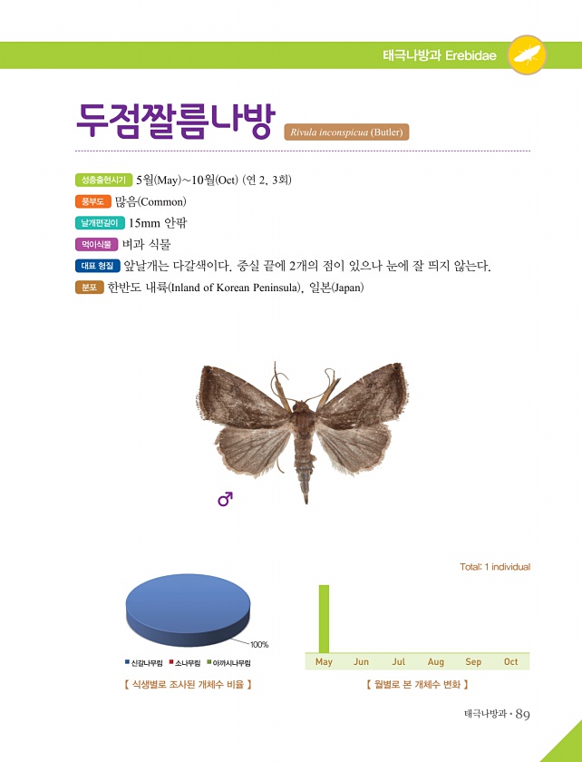 태극나방과?89 태극나방과 Erebidae 성충출현시기 5월 May 10월 Oct 연 2, 3회 풍부도 많음 Common 날개편길이 15mm 안팎 먹이식물 벼과 식물 대표 형질 앞날개는 다갈색이다. 중실 끝에 2개의 점이 있으나 눈에 잘 띄지 않는다. 분포 한반도 내륙 Inland of Korean Peninsula , 일본 Japan 두점짤름나방 Rivula inconspicua Butler 【 월별로 본 개체수 변화 】 Total1 individual 【 식생별로 조사된 개체수 비율 】 100% 신갈나무림 소나무림 아까시나무림 May Jun Jul Aug SepOct