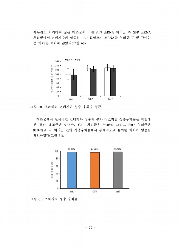 65 아무것도 처리하지 않은 대조군에 비해 Snf7 dsRNA 처리군 과 GFP dsRNA 처리군에서 번데기수와 성충의 수가 많았으나 dsRNA를 처리한 두 군 간에는 큰 차이를 보이지 않았다 그림 60 그림 60. 초파리의 번데기와 성충 우화수 평균. 대조군에서 전체적인 번데기와 성충의 수가 적었지만 성충우화율을 확인해 본 결과 대조군은 97.37%, GFP 처리군은 96.08% 그리고 Snf7 처리군은 97.94%로 각 처리군 간의 성충우화율에서 통계적으로 유의한 차이가 없음을 확인하였다 그림 61 그림 61. 초파리의 성충우화율.