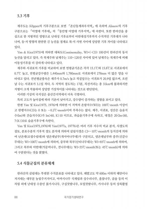 88 국가장기생태연구 5.3 기후 제주도는 K ppen의 기후구분으로 보면 「온난동계과우지역」에 속하며 Alissow의 기후 구분으로는 「아열대 기후대」의 「동안형 아열대 기후지역」에 속한다. 또한 한라산을 중 심으로 한 지형적인 영향으로 난대성 기후로부터 아한대성기후까지 수직적인 기후대가 나타 나며, 동·서 방향의 완만한 긴 능선을 경계로 북·서 사면 사이에 상당한 기후 차이를 나타내고 있다. Yim & Kira 1975 에 의하면 대륙도 Continentality, WI+ -CI 100선이 한라산의 동서 능선을 달리고 있다. 즉 북제주와 남제주는 110120선 사이에 있어 남제주는 북제주에 비해 이동성기후를 더 강하게 나타내고 있다. 제주와 서귀포의 기후를 비교하여 보면 연평균기온은 각각 15.1℃와 1...