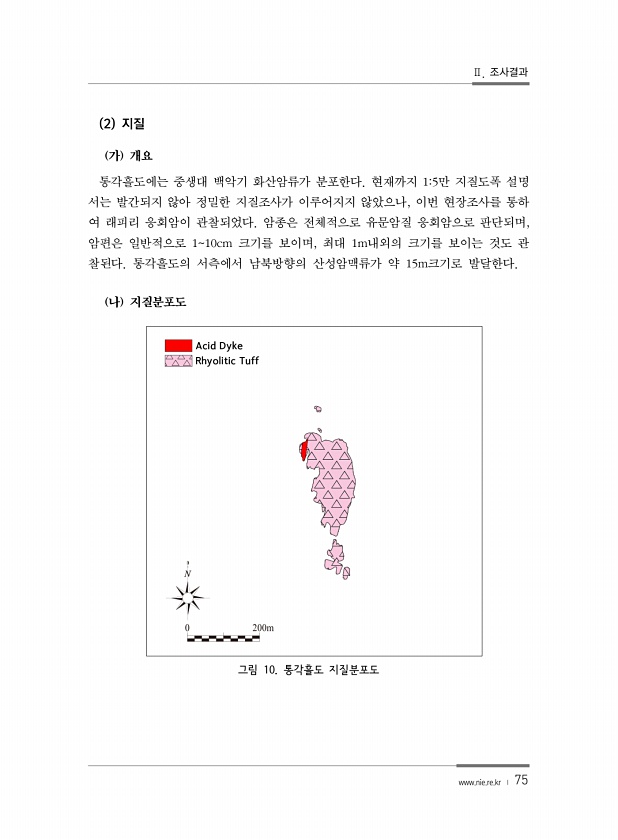 Ⅱ. 조사결과 www.nie.re.kr ? 75 2 지질 가 개요 통각흘도에는 중생대 백악기 화산암류가 분포한다. 현재까지 15만 지질도폭 설명 서는 발간되지 않아 정밀한 지질조사가 이루어지지 않았으나, 이번 현장조사를 통하 여 래피리 응회암이 관찰되었다. 암종은 전체적으로 유문암질 응회암으로 판단되며, 암편은 일반적으로 110cm 크기를 보이며, 최대 1m내외의 크기를 보이는 것도 관 찰된다. 통각흘도의 서측에서 남북방향의 산성암맥류가 약 15m크기로 발달한다. 나 지질분포도 그림 10. 통각흘도지질분포도