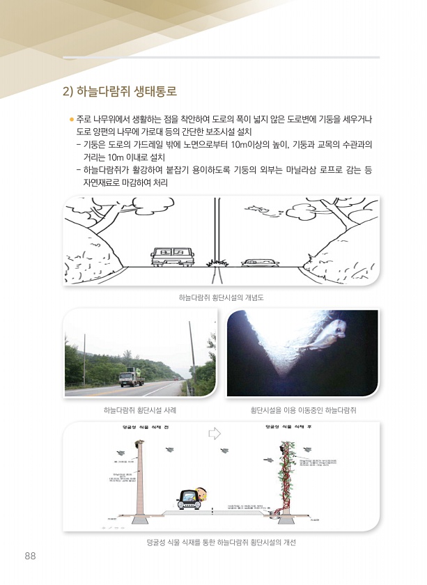 88 2 하늘다람쥐 생태통로 ● 주로 나무위에서 생활하는 점을 착안하여 도로의 폭이 넓지 않은 도로변에 기둥을 세우거나 도로 양편의 나무에 가로대 등의 간단한 보조시설 설치 기둥은 도로의 가드레일 밖에 노면으로부터 10m이상의 높이, 기둥과 교목의 수관과의 거리는 10m 이내로 설치 하늘다람쥐가 활강하여 붙잡기 용이하도록 기둥의 외부는 마닐라삼 로프로 감는 등 자연재료로 마감하여 처리 하늘다람쥐 횡단시설의 개념도 하늘다람쥐 횡단시설 사례 횡단시설을 이용 이동중인 하늘다람쥐 덩굴성 식물 식재를 통한 하늘다람쥐 횡단시설의개선