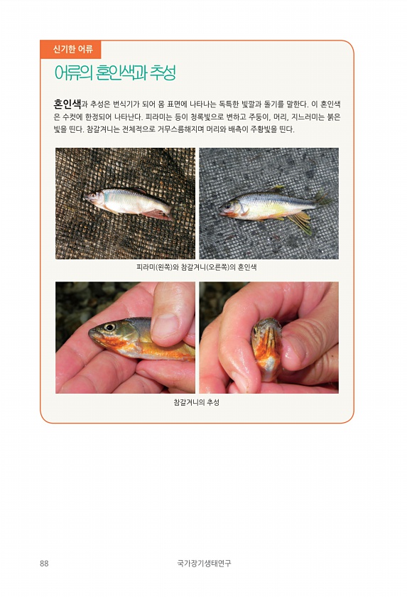 88 국가장기생태연구 신기한 어류 혼인색과 추성은 번식기가 되어 몸 표면에 나타나는 독특한 빛깔과 돌기를 말한다. 이 혼인색 은 수컷에 한정되어 나타난다. 피라미는 등이 청록빛으로 변하고 주둥이, 머리, 지느러미는 붉은 빛을 띤다. 참갈겨니는 전체적으로 거무스름해지며 머리와 배측이 주황빛을 띤다. 어류의 혼인색과 추성 참갈겨니의 추성 피라미 왼쪽 와 참갈겨니 오른쪽 의혼인색