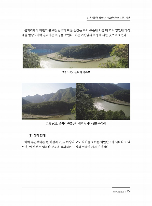 i. 동강유역 생태·경관보전지역의 지형·경관 www.nie.re.kr ? 75 운치리에서 하천의 유로를 급격히 바꾼 동강은 하미 부분에 이를 때 까지 양안에 하식 애를 발달시키며 흘러가는 특징을 보인다. 이는 기반암의 특성에 의한 것으로 보인다. 그림 i-25. 운치리 곡류부 그림 i-26. 운치리 곡류부의 배후 산지와 인근 하식애 5 하미 부근부터는 현 하상과 20m 이상의 고도 차이를 보이는 하안단구가 나타나고 있 으며, 이 부분은 백운산 부분을 통과하는 고성리 일대에 까지이어진다.