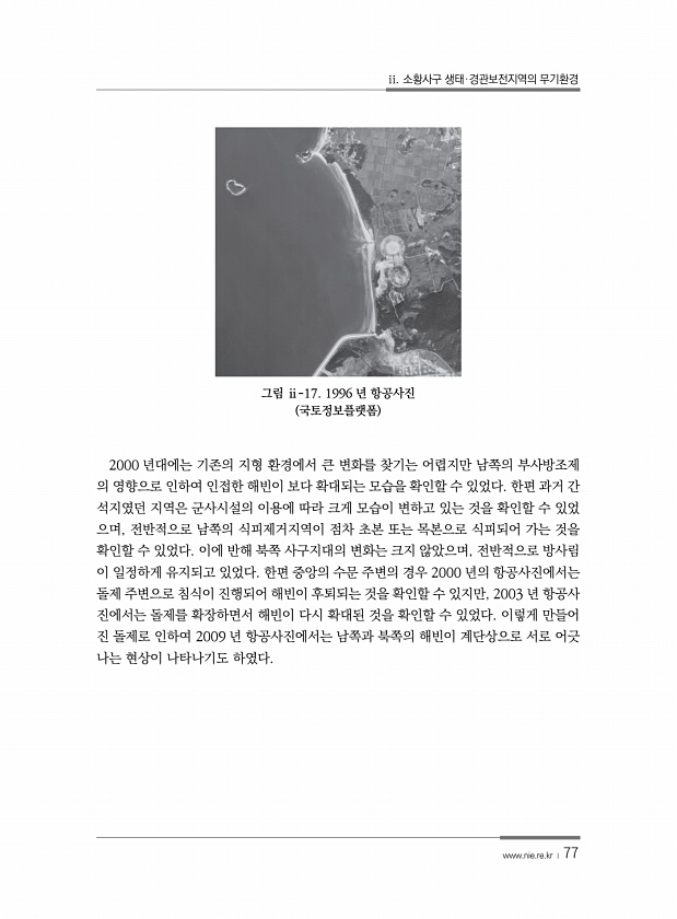 ii. 소황사구 생태·경관보전지역의 무기환경 www.nie.re.kr ? 77 그림 ⅱ-17. 1996 년 항공사진 국토정보플랫폼 2000 년대에는 기존의 지형 환경에서 큰 변화를 찾기는 어렵지만 남쪽의 부사방조제 의 영향으로 인하여 인접한 해빈이 보다 확대되는 모습을 확인할 수 있었다. 한편 과거 간 석지였던 지역은 군사시설의 이용에 따라 크게 모습이 변하고 있는 것을 확인할 수 있었 으며, 전반적으로 남쪽의 식피제거지역이 점차 초본 또는 목본으로 식피되어 가는 것을 확인할 수 있었다. 이에 반해 북쪽 사구지대의 변화는 크지 않았으며, 전반적으로 방사림 이 일정하게 유지되고 있었다. 한편 중앙의 수문 주변의 경우 2000 년의 항공사진에서는 돌제 주변으로 침식이 진행되어 해빈이 후퇴되는 것을 확인할 수 있...