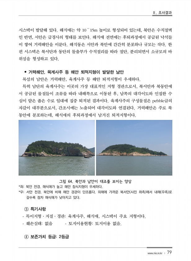 Ⅱ. 조사결과 www.nie.re.kr ? 79 시스텍이 발달해 있다. 해식애는 약 10~15m 높이로 형성되어 있는데, 북안은 수직절벽 인 반면, 서안은 급경사의 형태를 보인다. 해식애 전면에는 후퇴과정에서 공급된 낙석들 이 쌓여 거력해안을 이룬다. 해식동은 서안과 북안에 간간히 분포하나 규모는 작다. 한 편 시스텍은 북서단과 동단의 돌출부가 수직절리를 따라 절단, 분리되면서 소규모의 바 위섬을 형성하고 있다. ? 거력해안, 육계사주 등 해안 퇴적지형이 발달한 남안 목섬의 남안은 거력해안, 육계사주 등 해안 퇴적지형이 우세하다. 특히 남단의 육계사주는 이곳의 가장 대표적인 지형 경관으로서, 북서안과 북동안에 서 공급된 물질들이 조류를 따라 내해쪽으로 이동된 후, 남쪽의 대각이도와 인접한 수 심이 얕은 좁은...