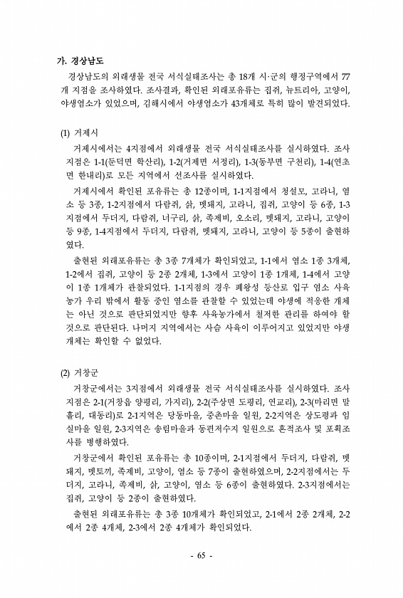 가. 경상남도 경상남도의 외래생물 전국 서식실태조사는 총 18개 시·군의 행정구역에서 77 개 지점을 조사하였다. 조사결과, 확인된 외래포유류는 집쥐, 뉴트리아, 고양이, 야생염소가 있었으며, 김해시에서 야생염소가 43개체로 특히 많이 발견되었다. 1 거제시 거제시에서는 4지점에서 외래생물 전국 서식실태조사를 실시하였다. 조사 지점은 1-1 둔덕면 학산리 , 1-2 거제면 서정리 , 1-3 동부면 구천리 , 1-4 연초 면 한내리 로 모든 지역에서 선조사를 실시하였다. 거제시에서 확인된 포유류는 총 12종이며, 1-1지점에서 청설모, 고라니, 염 소 등 3종, 1-2지점에서 다람쥐, 삵, 멧돼지, 고라니, 집쥐, 고양이 등 6종, 1-3 지점에서 두더지, 다람쥐, 너구리, 삵, 족제비, 오소리, 멧돼지, 고...