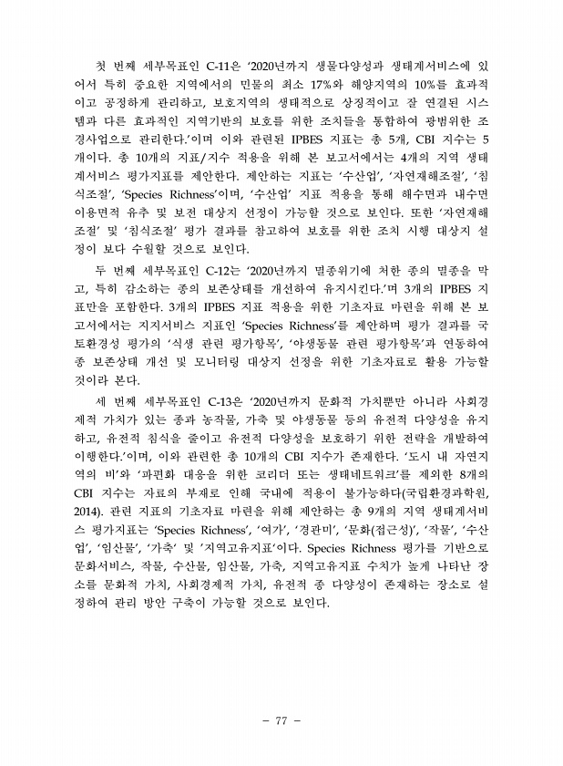 77 첫 번째 세부목표인 C-11은 ‘2020년까지 생물다양성과 생태계서비스에 있 어서 특히 중요한 지역에서의 민물의 최소 17%와 해양지역의 10%를 효과적 이고 공정하게 관리하고, 보호지역의 생태적으로 상징적이고 잘 연결된 시스 템과 다른 효과적인 지역기반의 보호를 위한 조치들을 통합하여 광범위한 조 경사업으로 관리한다.’이며 이와 관련된 IPBES 지표는 총 5개, CBI 지수는 5 개이다. 총 10개의 지표/지수 적용을 위해 본 보고서에서는 4개의 지역 생태 계서비스 평가지표를 제안한다. 제안하는 지표는 ‘수산업’, ‘자연재해조절’, ‘침 식조절’, ‘Species Richness’이며, ‘수산업’ 지표 적용을 통해 해수면과 내수면 이용면적 유추 및 보전 대상지 선정이 가능할 것으로 보인다. 또한 ‘...