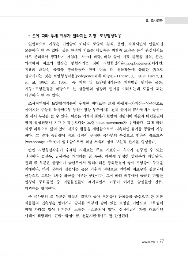 Ⅱ. 조사결과 www.nie.re.kr ? 77 곳에 따라 우세 여부가 달라지는 지형·토양형성작용 일반적으로 지형은 기반암이 아니라 토양이 침식, 운반, 퇴적되면서 만들어진 모습이라 할 수 있다. 생물 환경의 기초를 제공하는 지형과 토양은 동적 관점에서도 서로 분리해서 생각하기 어렵다. 유수나 파랑, 바람 등이 지표 물질을 침식, 운반, 퇴적하여 지표의 형상을 변형시키는 것이 지형형성작용 morphogenesis 이라면, 지표의 쇄설성 물질을 생물활동과 함께 더욱 더 생물활동에 유리한 흙으로 성숙시키는 것은 토양형성작용 pedogenesis 에 해당된다 Tricart, J., 1972; Tricart, J, et. al, 1992; 오, 1996 즉 지형 및 토양형성작용은 지형발달 단계는 물론, 지형·토양환...