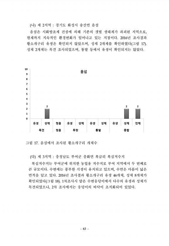63 나 제 2지역 경기도 화성시 송산면 음섬 음섬은 시화방조제 건설에 의해 기존의 갯벌 생태계가 파괴된 지역으로, 현재까지 지속적인 환경변화가 일어나고 있는 지점이다. 2016년 조사결과 황소개구리 유생은 확인되지 않았으며, 성체 2개체를 확인하였다 그림 17 성체 2개체는 목견 조사되었으며, 통발 등에서 유생이 확인되지는 않았다. 그림 17. 음섬에서 조사된 황소개구리 개체수 다 제 3지역 충청남도 부여군 충화면 복금리 복심저수지 복심저수지는 부여군에 위치한 농업용 저수지로 부여 지역에서 두 번째로 큰 규모이다. 수변에는 풍부한 식생이 유지되고 있으며, 수면은 마름이 넓은 면적을 덮고 있다. 2016년 조사결과 황소개구리 유생 46개체, 성체 8개체가 확인되었다 그림 18 1차조사시 얕은 수변웅덩이에서 ...